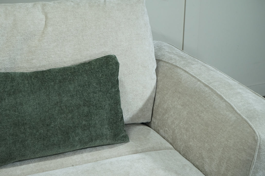 - Contrasting velvet accent cushions in rich green for a touch of modern elegance