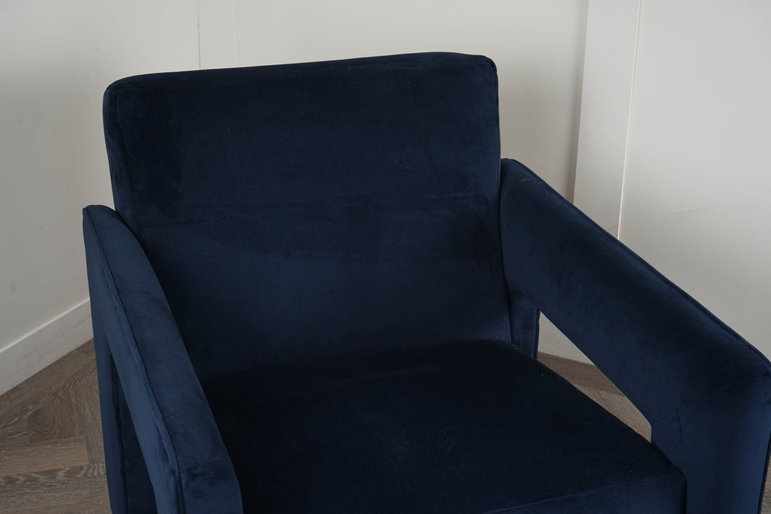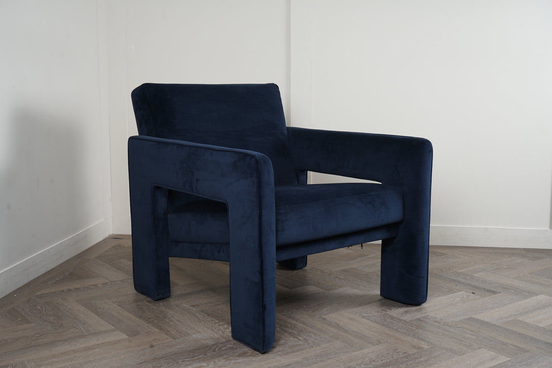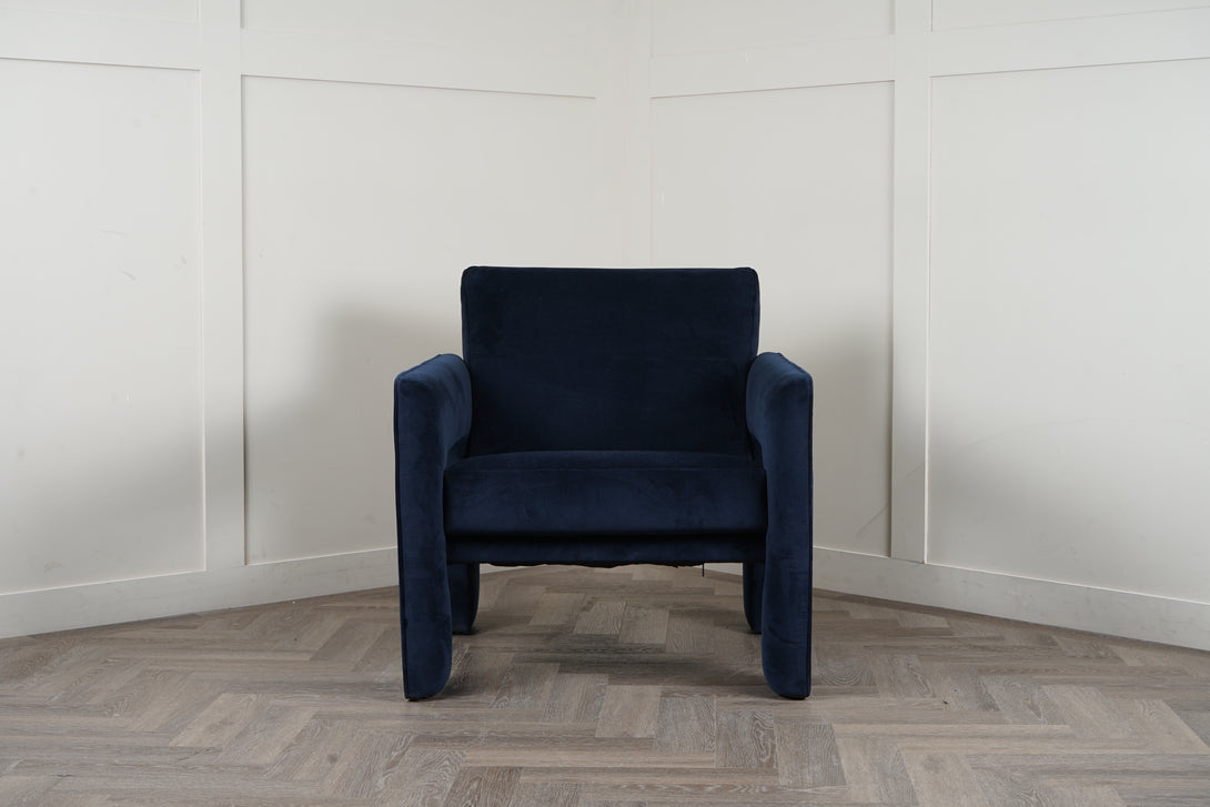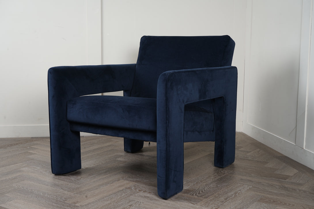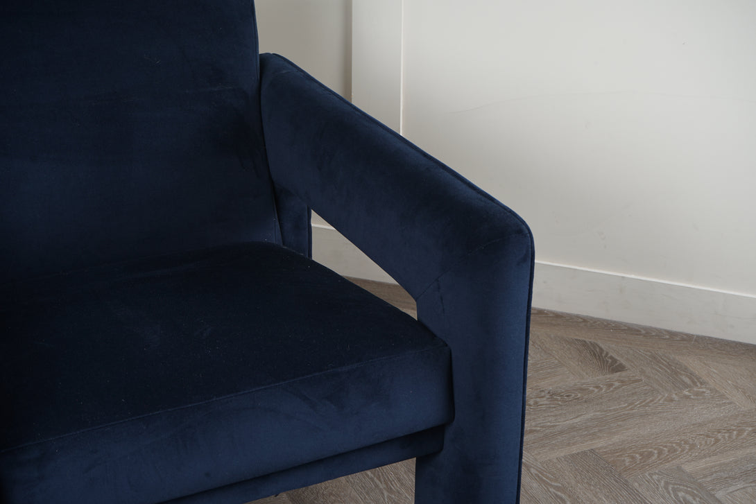 The Blocky Armchair in Navy Velvet is a striking fusion of modern design and luxurious comfort. With its sculptural silhouette, distinctive cut-out sides, and refined piped arm detailing, this armchair brings bold, architectural elegance to any interior. The soft navy velvet upholstery enhances its statement shape while offering a warm, inviting feel — perfect for contemporary spaces that demand both style and substance.