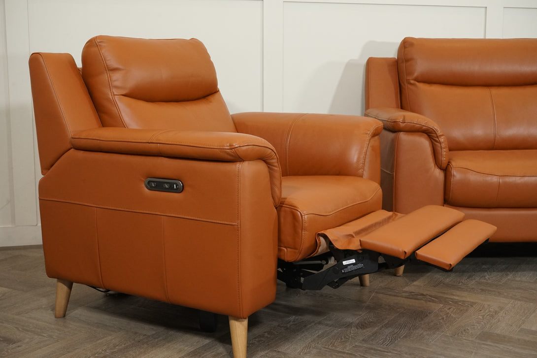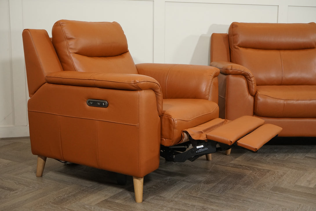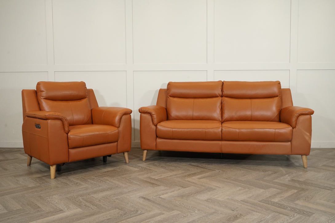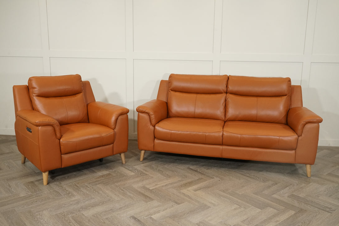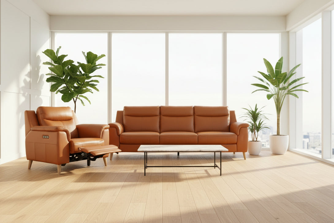 Brodie 3 Seater Sofa & Power Reclining Armchair Set in Tan Leather is the perfect pairing of sleek design, sumptuous comfort, and modern functionality. Crafted from premium quality leather in a warm Tan finish, this versatile duo brings effortless elegance and everyday practicality to any living space.