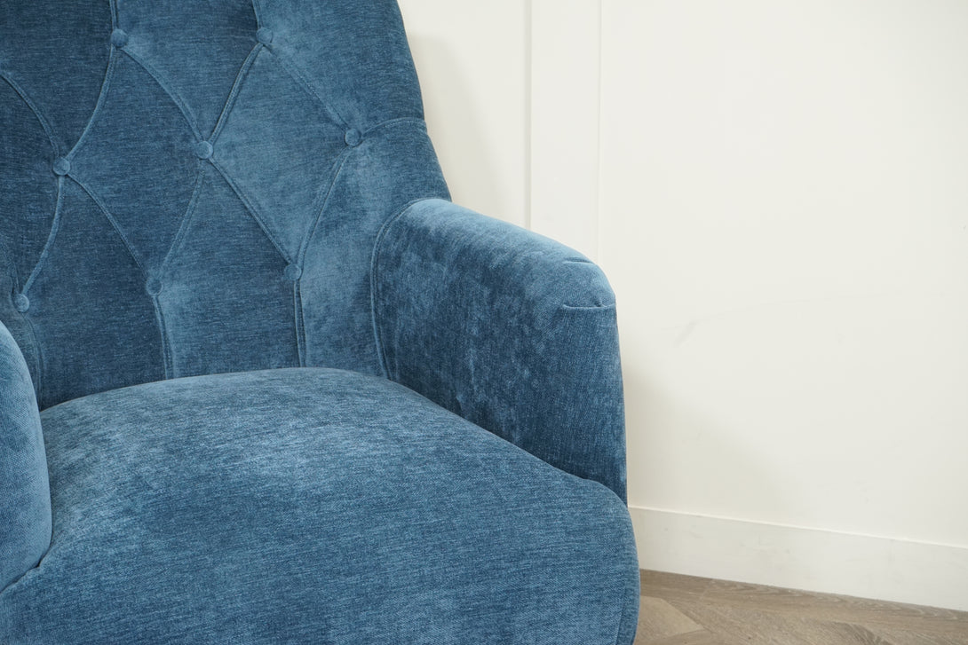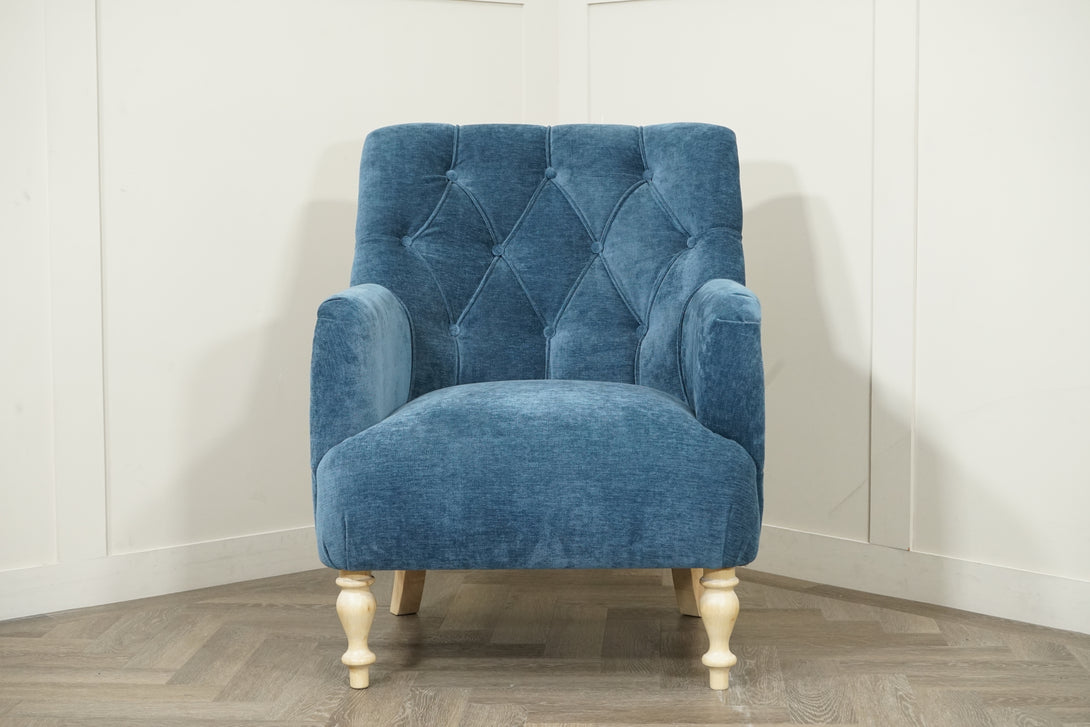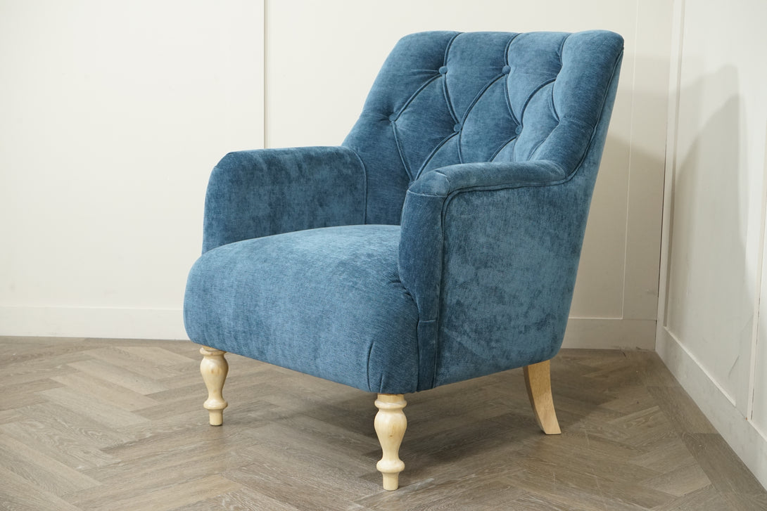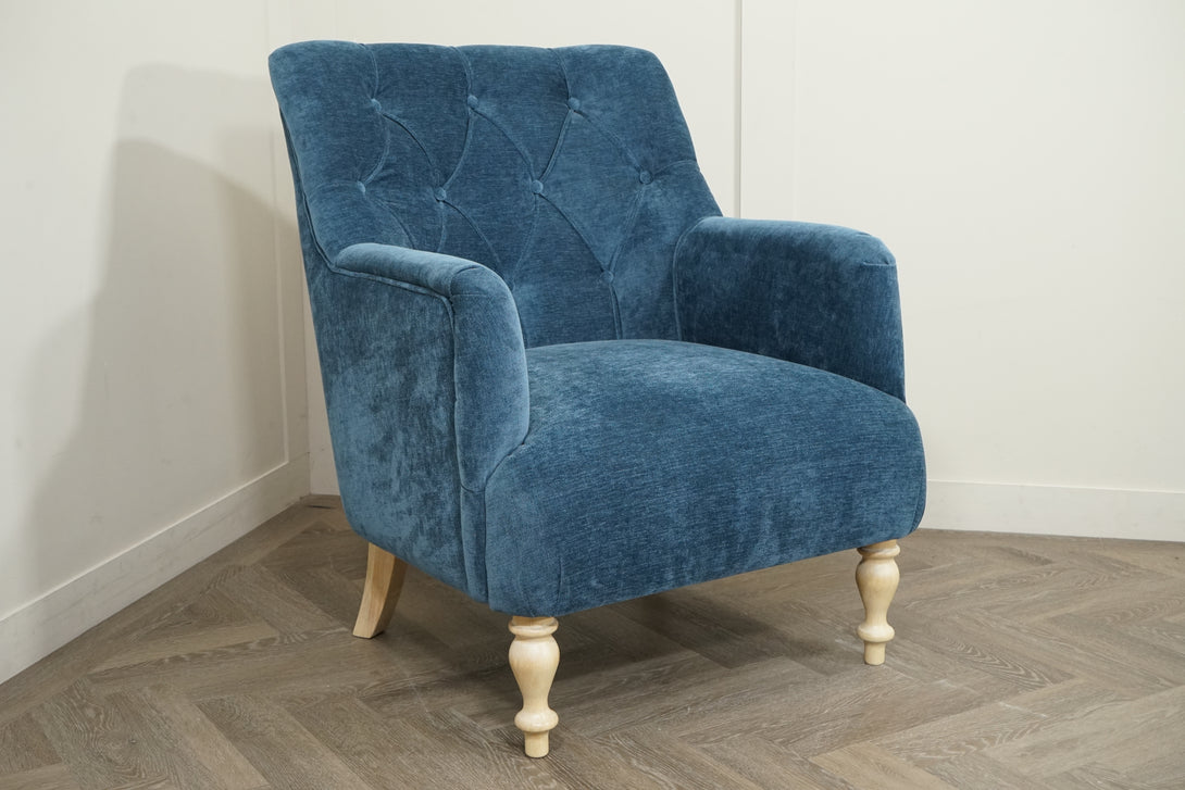 Classic Button Armchair, Light Leg, Navy brings elegant charm and refined structure to any interior. With its beautifully tufted button-back detailing and gently flared arms, this armchair delivers a timeless, more formal silhouette — balanced by the relaxed texture of its soft navy upholstery and light, turned wood legs.