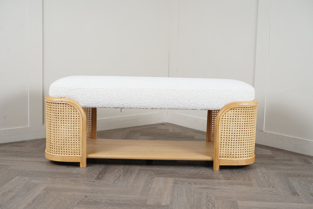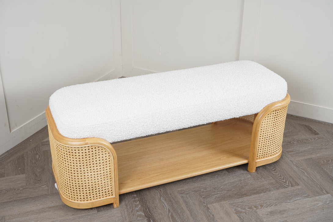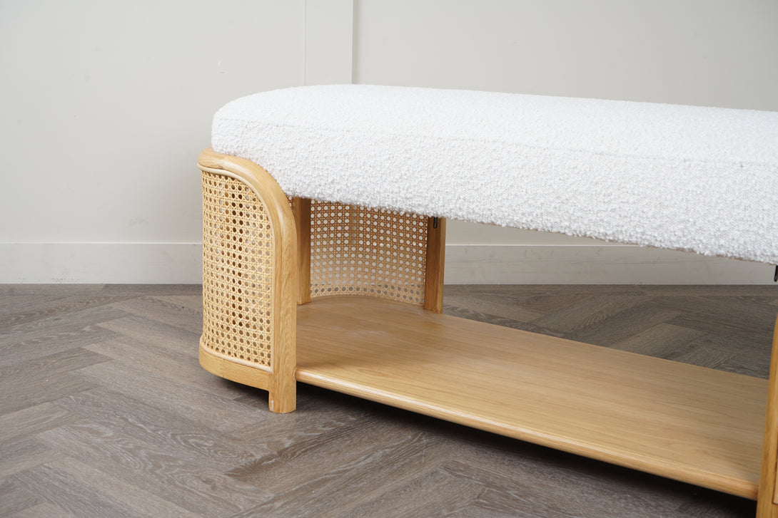 A perfect blend of craftsmanship and design, the Dime Bench brings effortless sophistication to any space. Its tactile bouclé upholstery pairs beautifully with the natural rattan and warm wood tones, making it as eye-catching as it is practical.