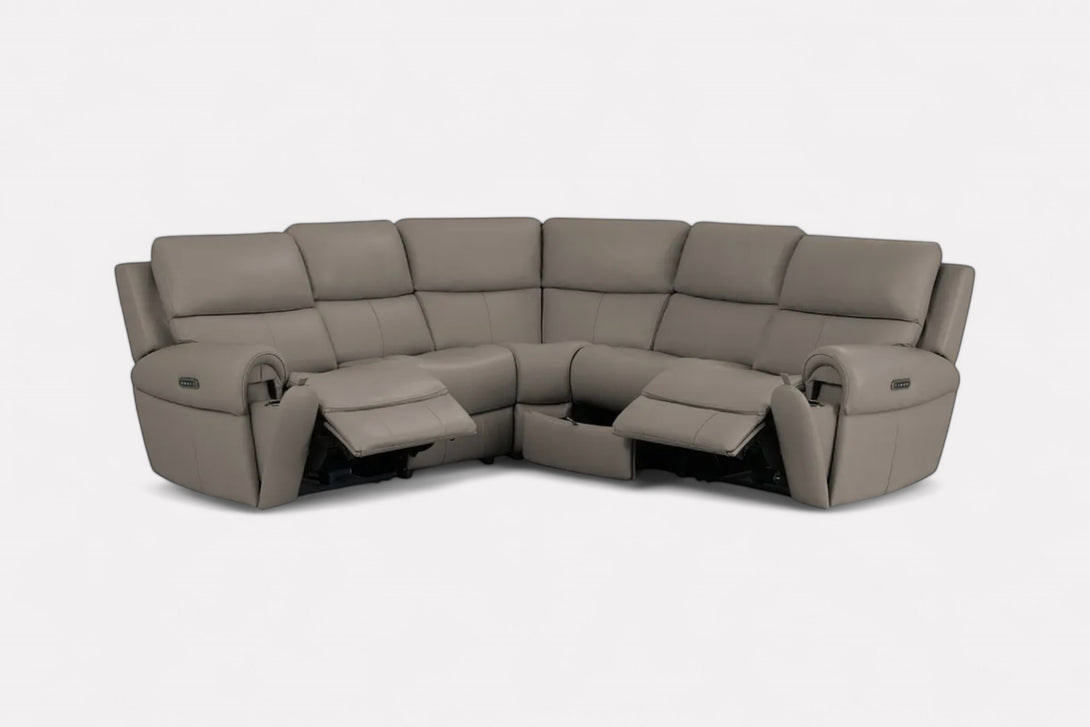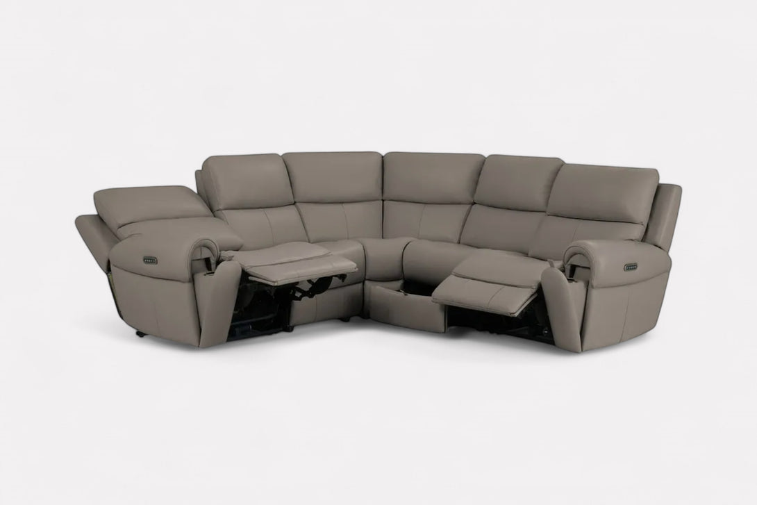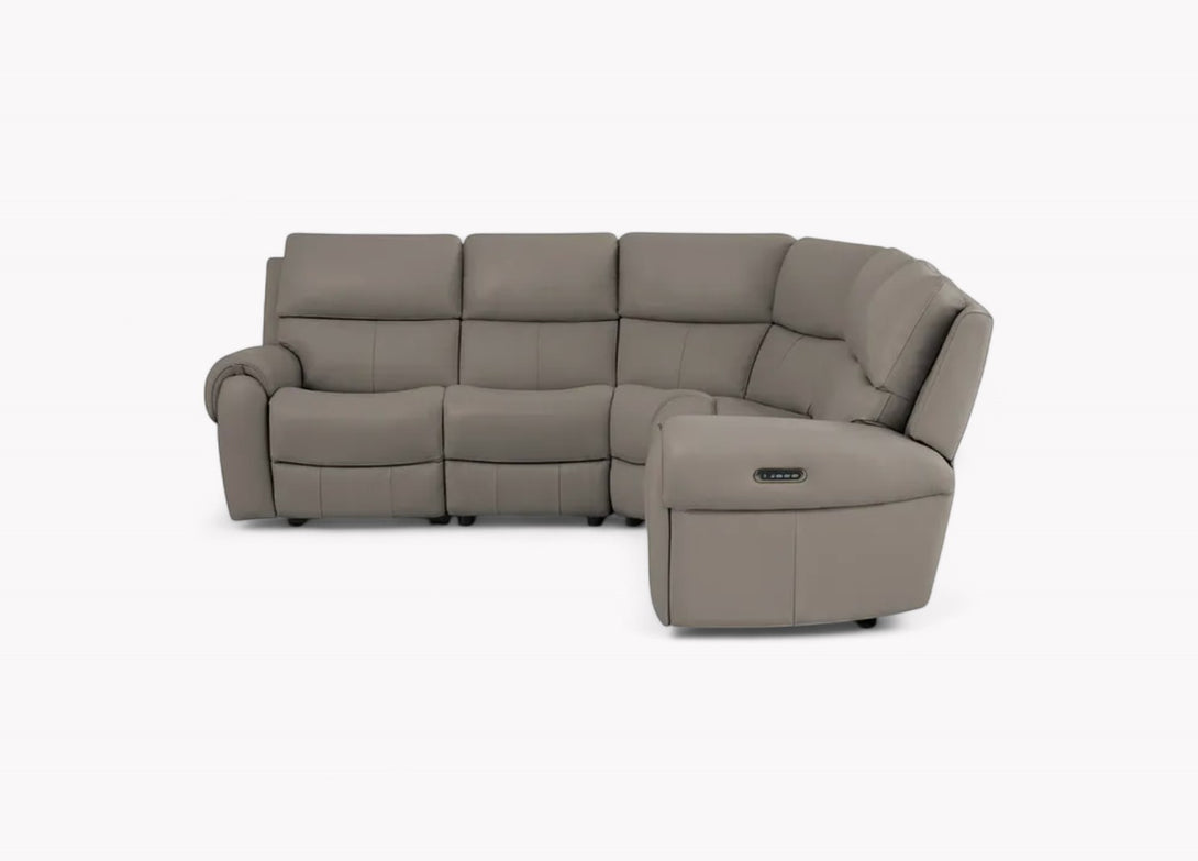 The Ezra Modular 5 Seat Corner Power Recliner in Oyster Leather is designed to be the heart of your home – a luxurious, spacious sofa that combines contemporary design with exceptional comfort. With deep pocket-sprung seats and sumptuous cushioning, it offers a supportive and indulgent sit, perfect for everyday lounging or relaxed family moments.
