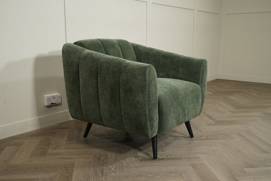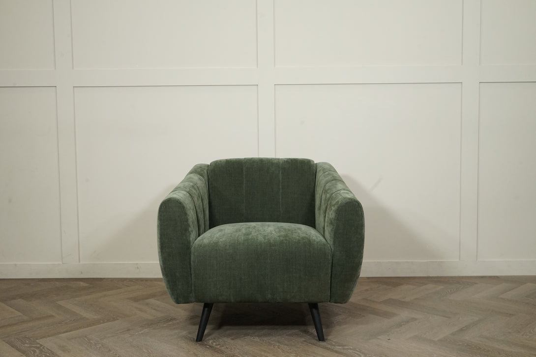 Vertical channel detailing along the sides adds subtle dimension, and the tapered black legs give it a light, contemporary lift. Perfect as a statement piece in living rooms, bedrooms, or reading nooks, the Grove blends organic calm with refined modern style.