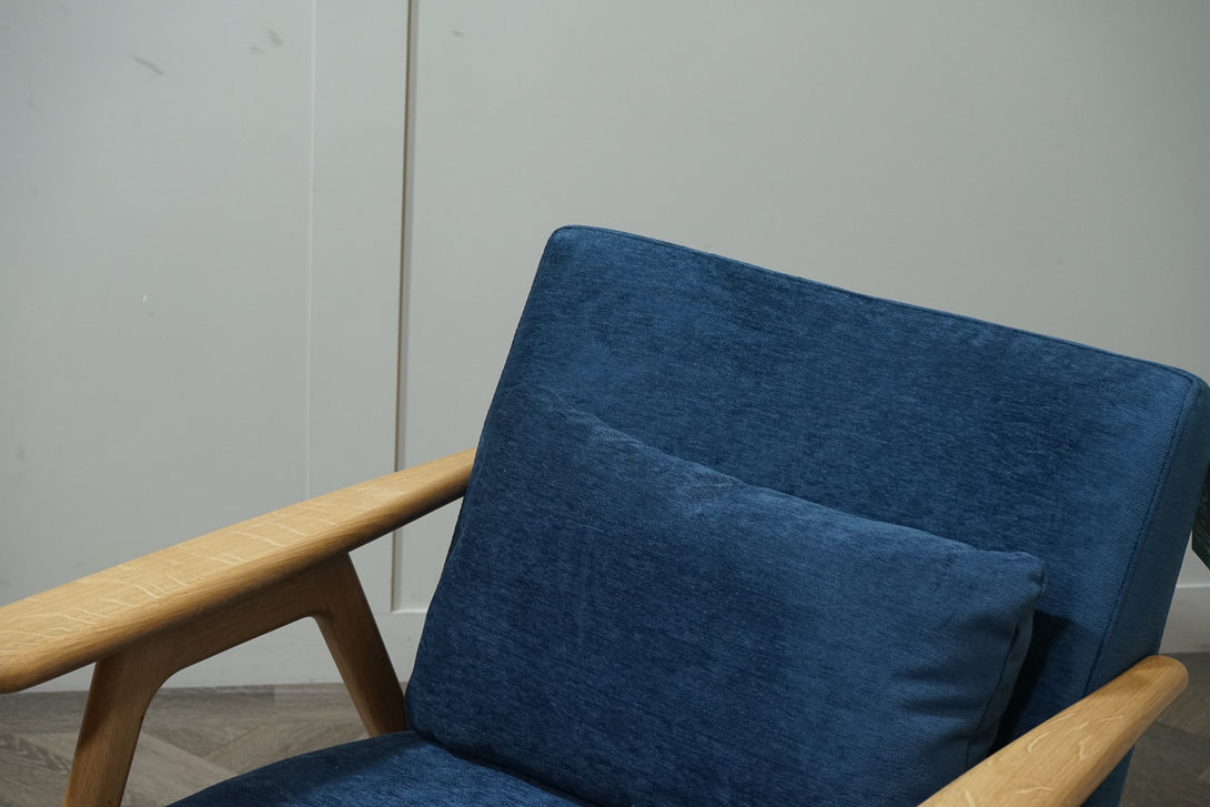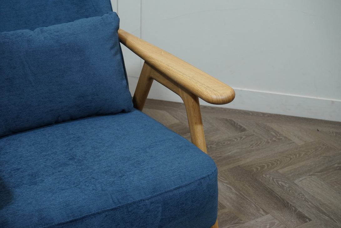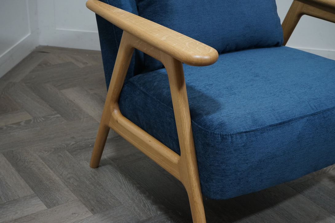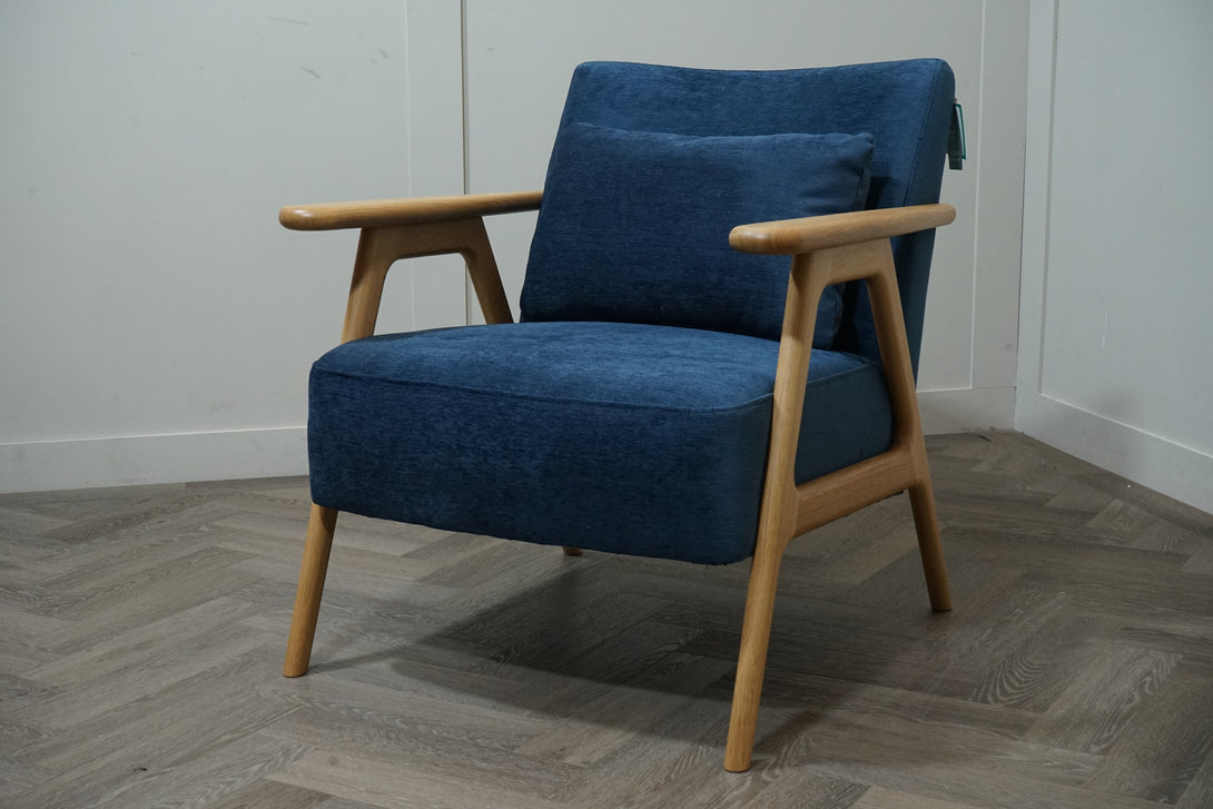 The Hendricks Accent Chair in Aquaclean Titan Navy perfectly captures the effortless charm of mid-century design. With its sculpted oak frame, angled legs and low-slung profile, this beautifully crafted chair adds timeless character and style to any living space. Upholstered in Aquaclean performance fabric, it not only looks stunning but is also practical — designed to resist everyday spills and stains with ease.