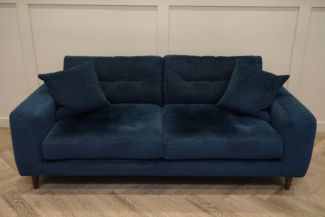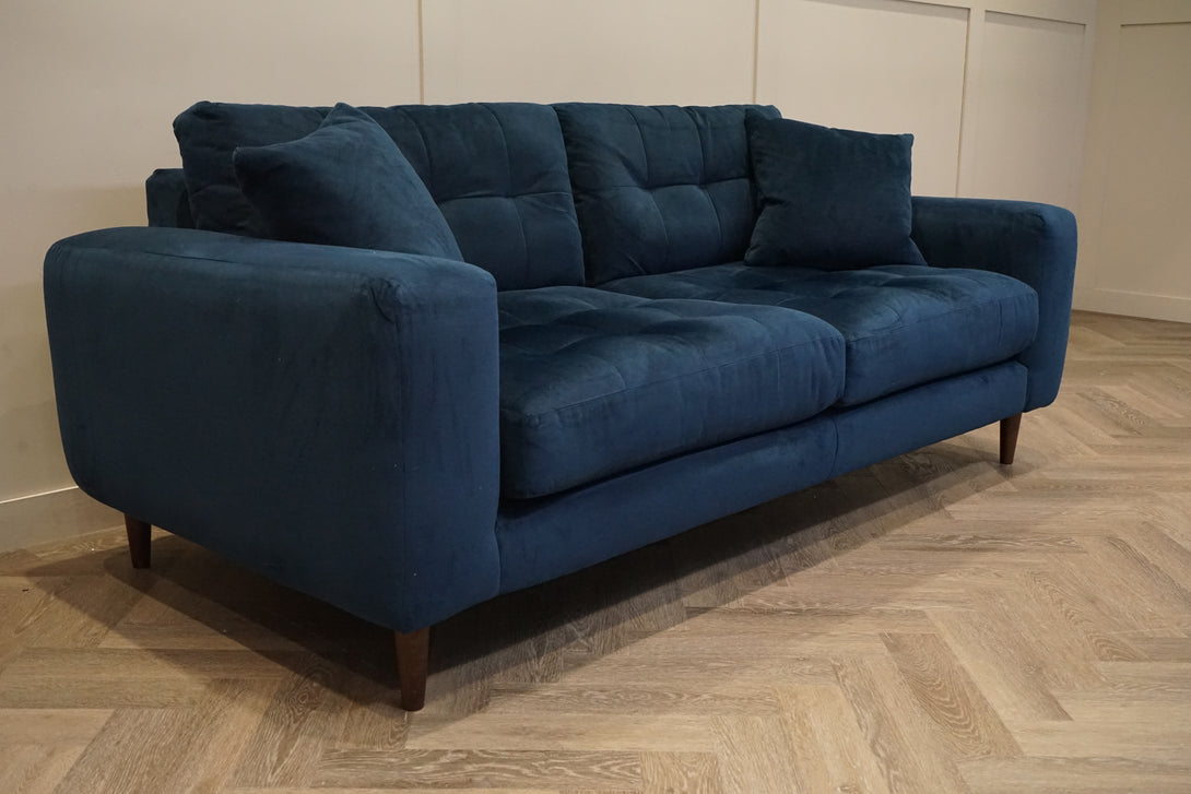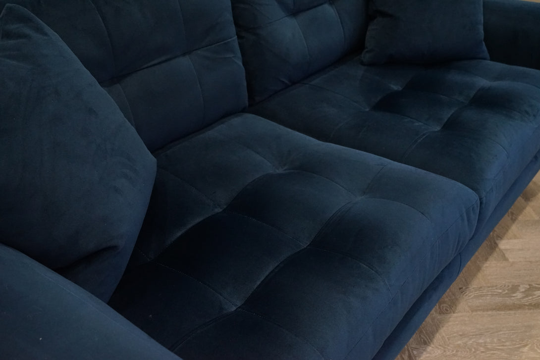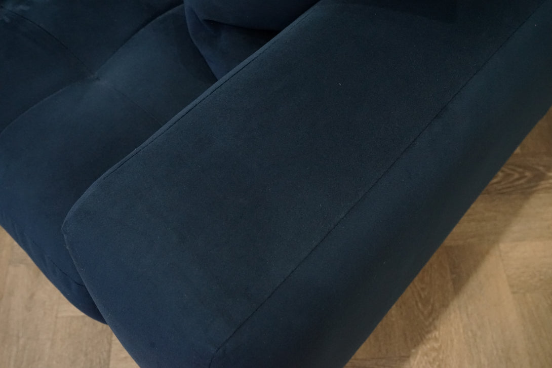 The Kora sofa in Plush Indigo is designed for ultimate lounging, with wide arms and deep cushions. Upholstered in a rich velvet-like indigo, it brings both sophistication and comfort to any living space.