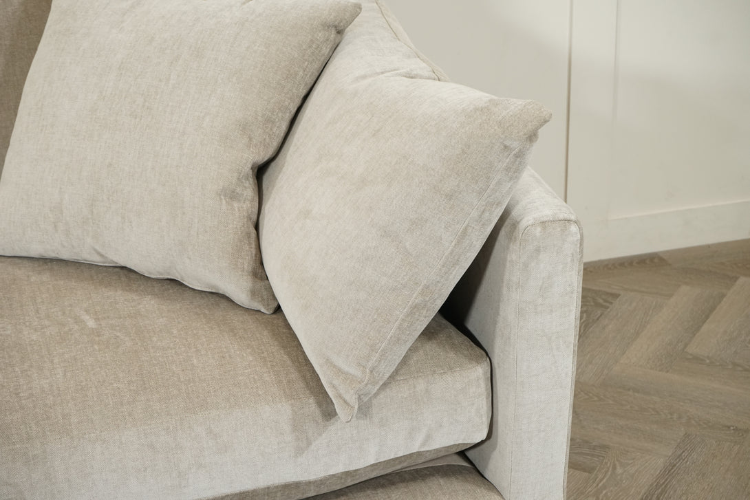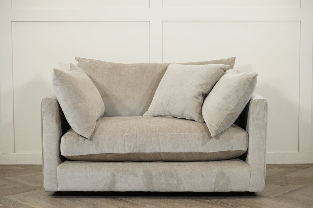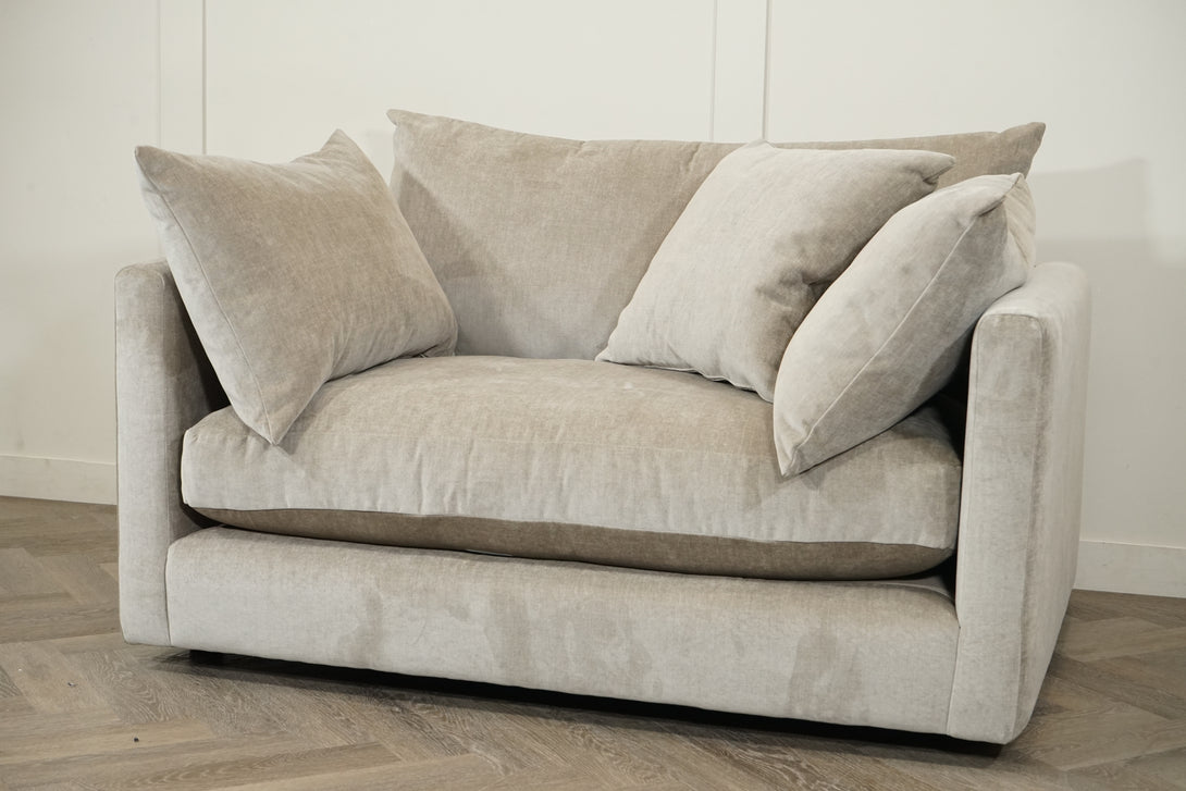 - Snuggler chair upholstered in luxe Dusk Latte velvet‑feel fabric