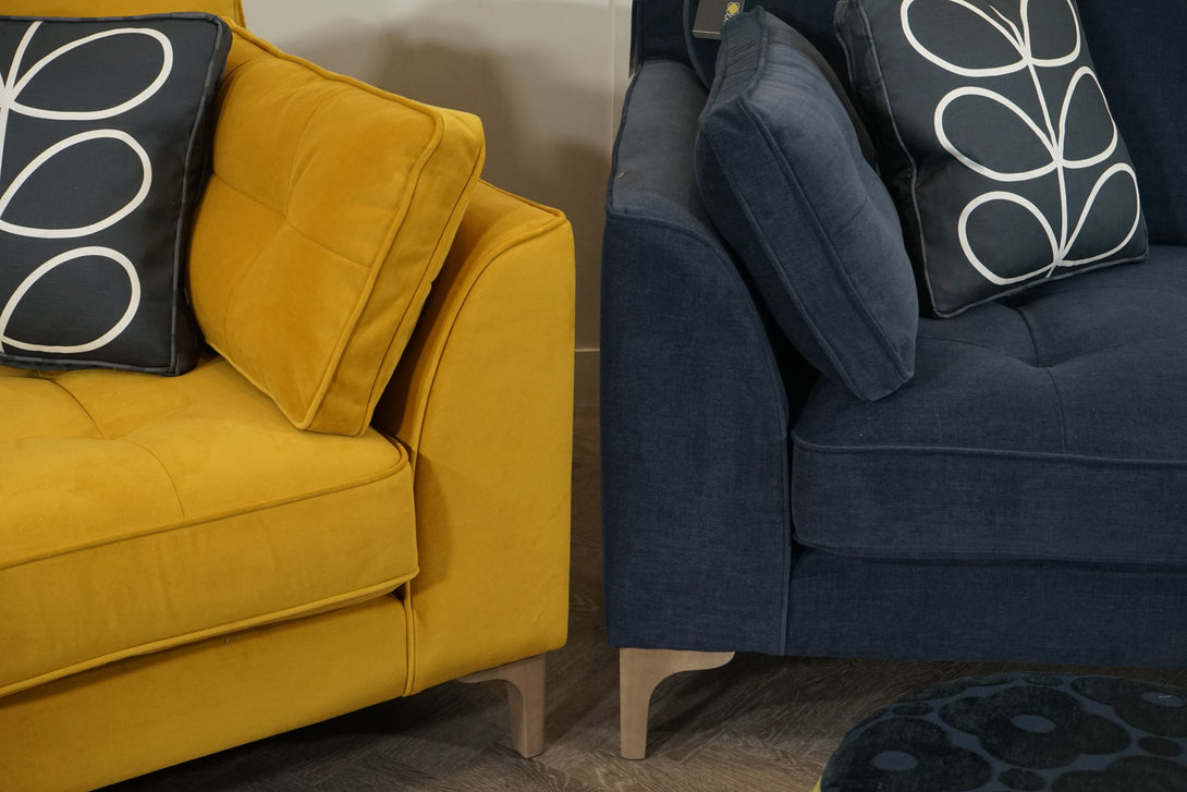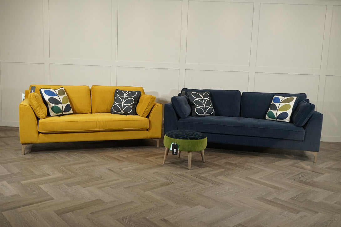 This stunning sofa set from the Orla Kiely Arklow range blends signature retro-inspired design with vibrant, contemporary appeal. The 3 Seater in Clara Sunflower and the 2 Seater in Clara Navy are perfectly coordinated, each upholstered in plush, high-quality velvet fabric with elegant piping and tapered wooden legs.