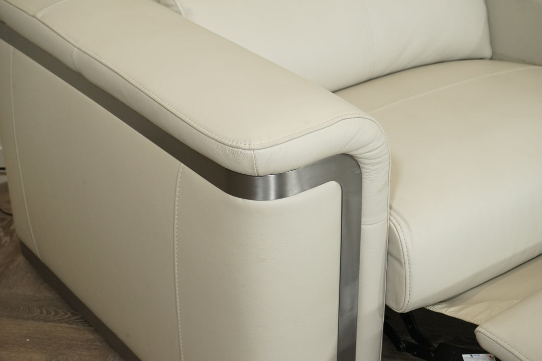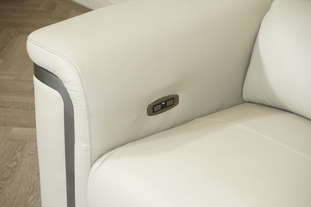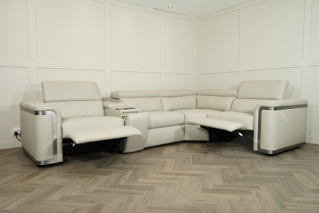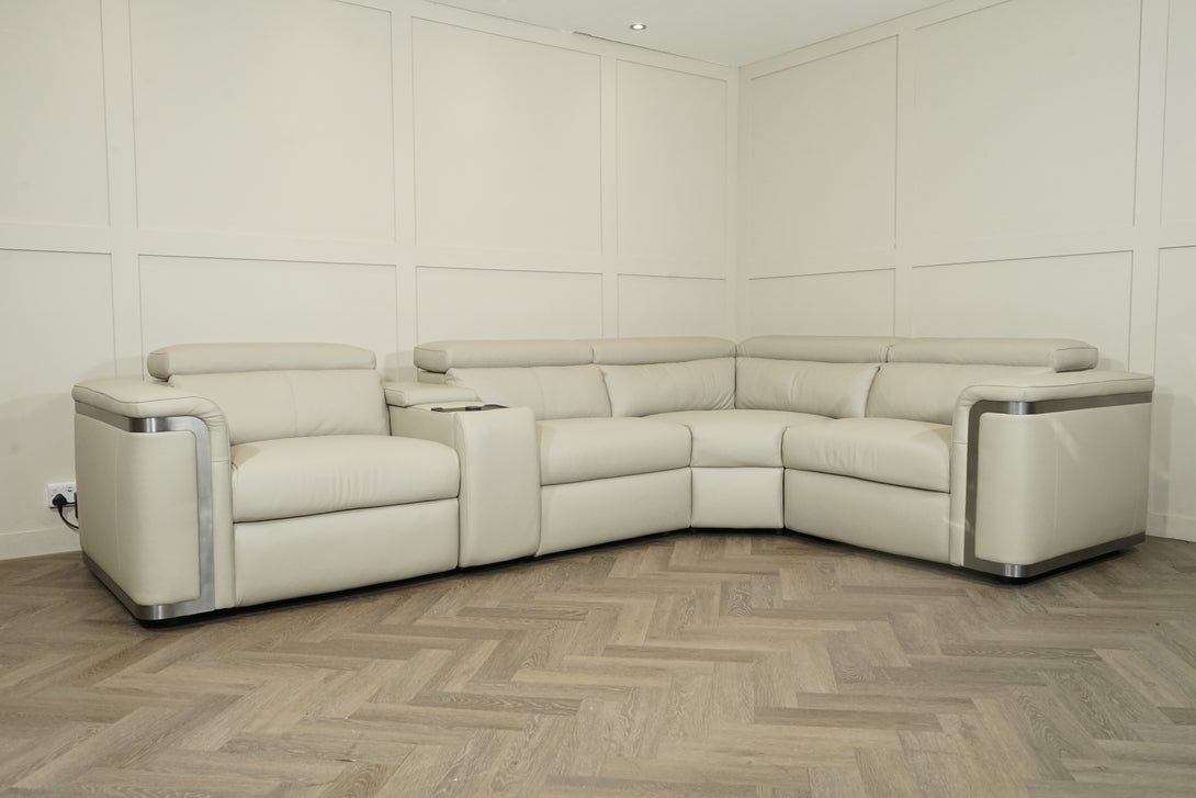 Upholstered in rich taupe grey leather, this ultra-modern design offers deep, sumptuous seating and smart tech integration that makes it the ultimate centrepiece for any cinema room or family lounge.