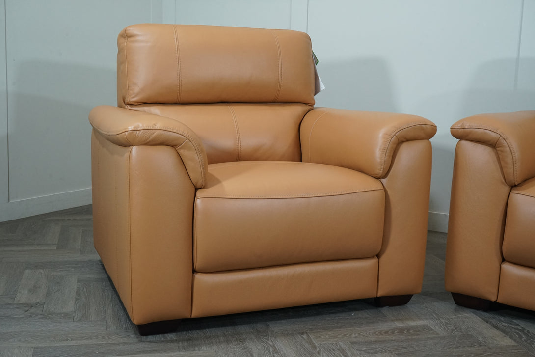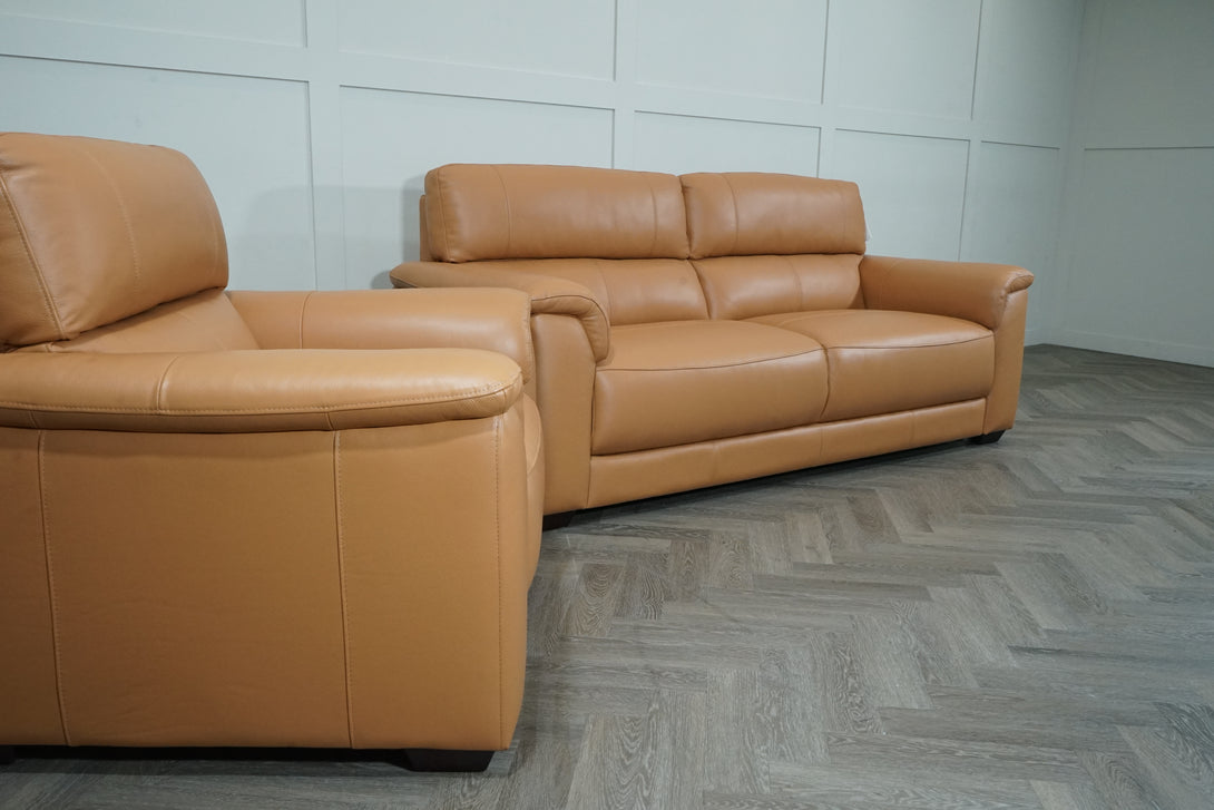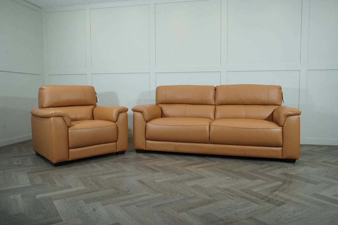 The Rimini 3 Seater Leather Sofa & Armchair in Tan exudes timeless style and luxurious comfort. Crafted from 100% genuine supple leather, this beautifully made set combines elegant form with everyday practicality. Its smooth, rich tan finish and high-back design make it a statement addition to both classic and modern interiors.