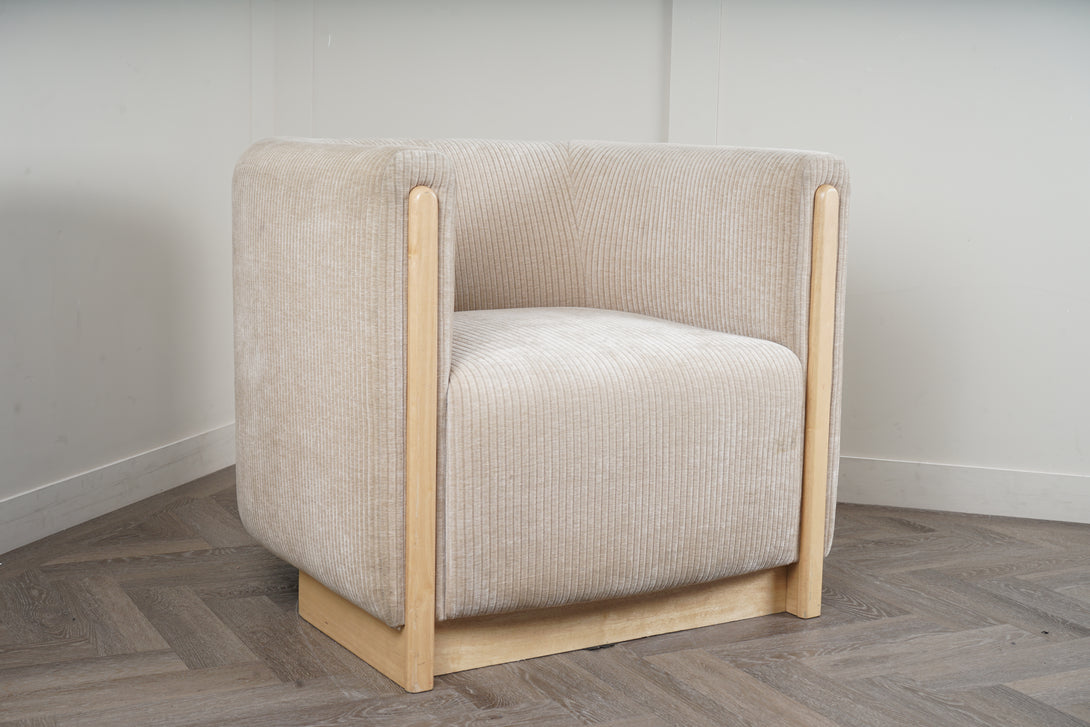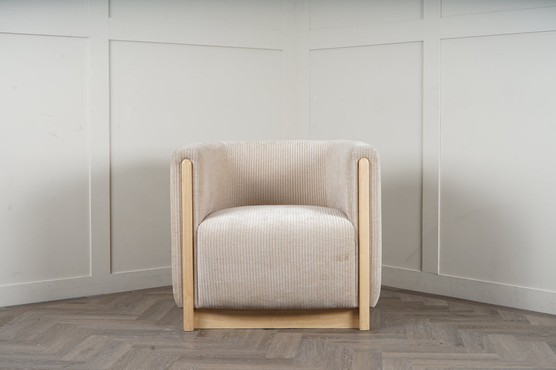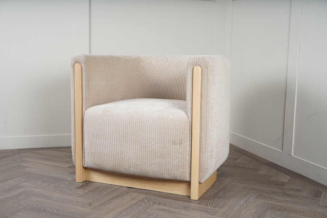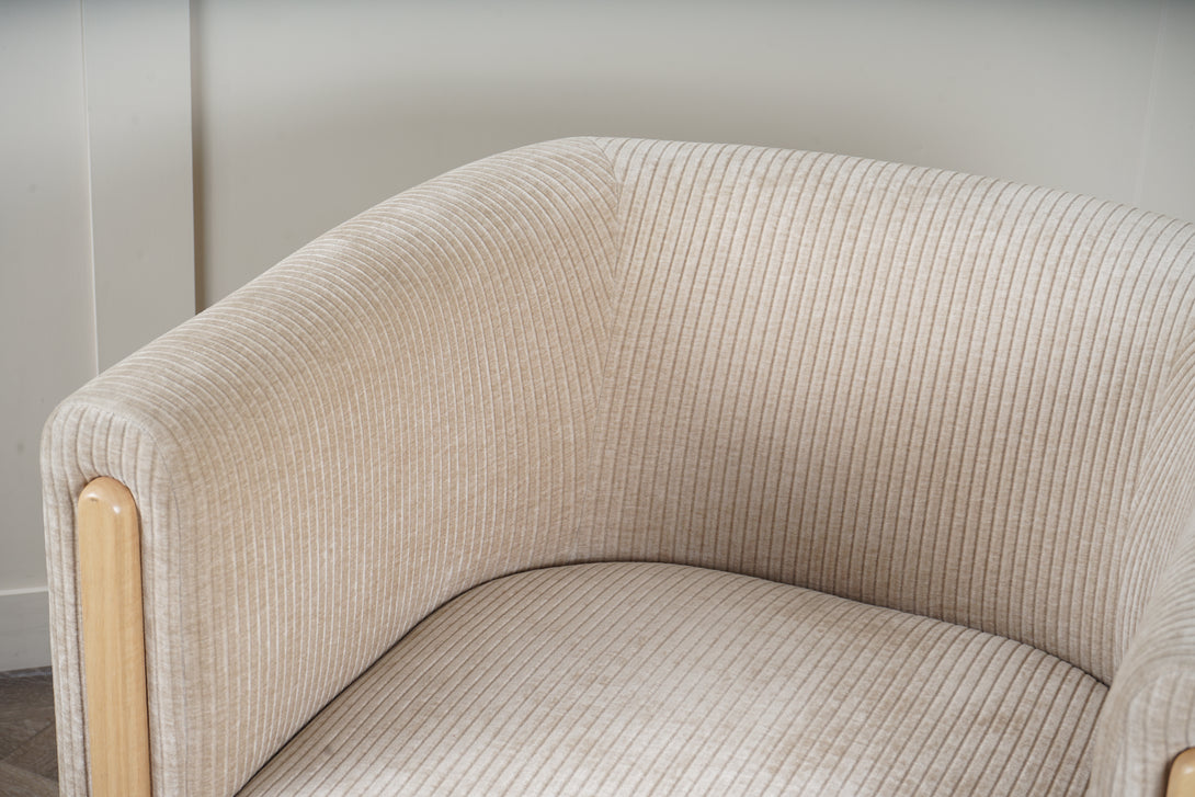 The Vila Tub Armchair in Natural Corduroy combines compact design with irresistible comfort, making it the perfect choice for cosying up in style. Its gently curved tub silhouette offers a snug, supportive seat, while the soft textured corduroy upholstery and tonal wooden detailing add warmth and character to any room.